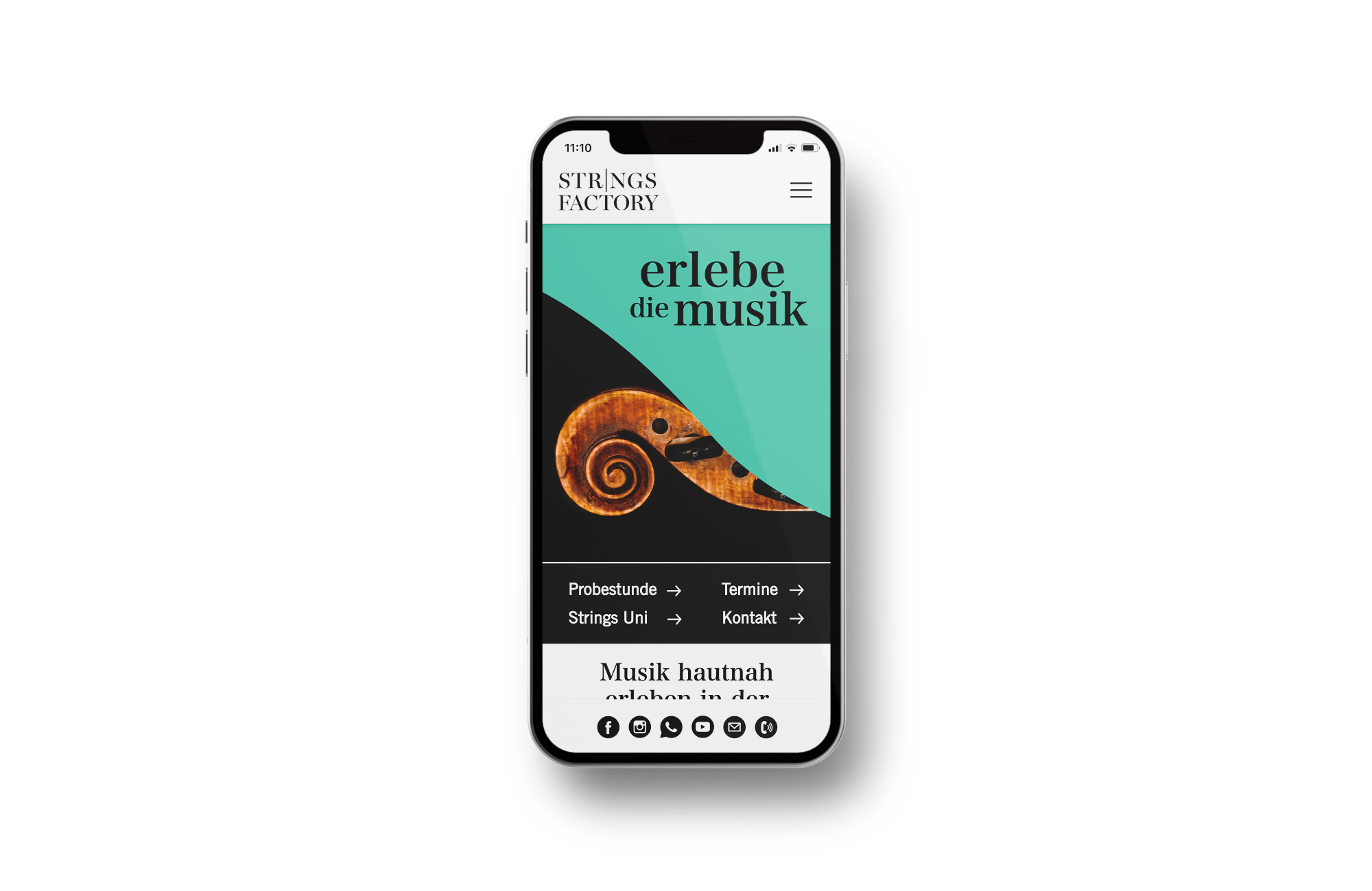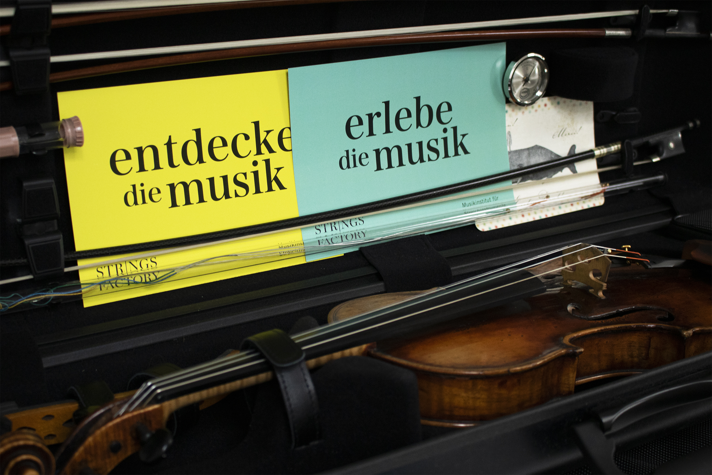Von Profimusikern für Kinder, Jugendliche und Erwachsene auf den Streichinstrumenten. Leidenschaft, Flexibilität, ein gesunder Ehrgeiz und Freude am Erlernen der Streichinstrumente stellen den zentralen Kern der Musikvermittlung dar. Die Gestaltung orientiert sich an der Offenheit und Individualität des Unterrichtskonzeptes. Die variable Farbpalette von blau, mint und gelb, der spielerische Umgang mit Typografie, Farbflächen sowie Fotografien der Instrumente – ebenso der flexible Umgang mit den definierten Claims schaffen ein positiv wirkendes und anregendes visuelles Gesamtbild.